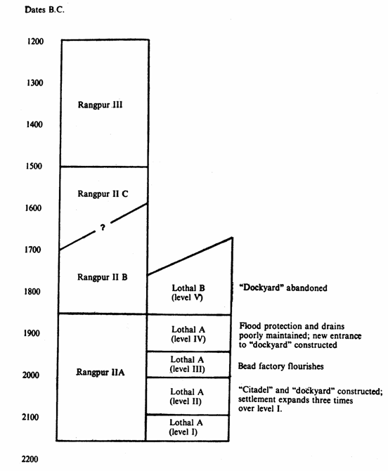[13] The bibliography for these two sites is fairly extensive. For Rangpur yearly reports are available in IAR : 1953-54, pp. 7-8; IAR : 1954-55, pp. 11-12. A final report on Ranpur was published. See EAR. There were three earlier excavations at the site. M.S Vats, "Rangpur,"  Annual Report of the Archaeological Survey of India, 1934-35 (New Delhi : Archaeological Servey of India, 1937), pp. 34-38, and pls. XII, XIV; g.S. ghurye, "Two sites in Kathiawar," Journal of the University of Bombay 8, pt. i (1939): pp. 3-12; M.g. Dikshid, "Excavations at Rangpur : 1947," Bulletin of The Deccan College Research Institute 11, no. 1 (1950) : pp. 3-55. Lothal, the larger and more completely excavated of the two sites, has yet to be published in final form. Yearly reports are available in : IAR : 1954-55 p. 12; IAR : 1955-56 pp. 6-7; IAR : 1956-57, pp. 15-16; IAR : 1957-58, pp. 11-12; IAR : 1958-59, pp. 13-15; IAR : 1959-60, pp. 16-18; IAR : 1961-62, pp. 9-10; IAR : 1962-63, p. 7. There are two very fine, well illustrated reviews of Lothal in Lalit Kala, S.R. Rao, "Excavations at Lothal," Lalits Kala, pp. 83-89; and S.R. Rao, "Further Excavations at Lothal," Lalit Kala, pp. 14-30. Another source has also recently appeared. S.R. Rao, Lothal and the Indus Civilization (Bombay : Asia Publishing House, 1973). Also, S.R. Rao, Lothal Excavations (New Delhi, Archaeological Survey of India, 1980).