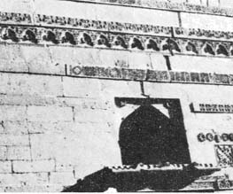 تصوير 67- اولهه وارو محراب، جنهن مٿان هڪ ٻئي هيٺان ٽي ونگون آهن، محراب جي ٻنهي پاسن کان پٿر جا خوبصورت پاوا ڏسجن ٿا ٽئين ونگ هيٺان ٻٽاپاوا آهن، وچئين ونگ جي بنيادن وٽان هڪ اهڙي شئڀي اڀرندي نظر اچي ٿي جيڪا سڃاڻي ڪانه ٿي سگهجي. هيءُ اهڙو طريقو آهي، جنهن ۾ ديوار ۾ ڇڄي وانگي ٻنوڙو (Corbelled) رکي ونگ ٺاهي ويندي آهي.